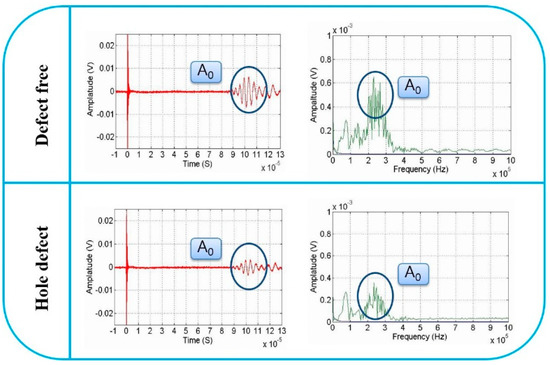 The signal of both the defect-free and with the defect areas have been obtained in both time and frequency domains. As shown in Figure 21, the signal attenuates clearly due to the appearance of the defect. Only an A0 mode Lamb wave can be detected, as mentioned above. The generated S0 mode was filtered by the air-coupled transducer due to its detection range. Only one mode of the Lamb wave was needed for the tomography once the new DHB method was used. This is also another advantage of the new algorithm. For example, the probabilistic algorithm requires at least two modes of Lamb waves for comparison. The tomographic imaging technique used in this work is based on the wave attenuation. The attenuation law of a Lamb wave is subject to Equation (12), and the equation for data projection is given in Equation (13). The parameter in those two equations is the attenuation coefficient, is the signal amplitude, and is the propagation distance.
