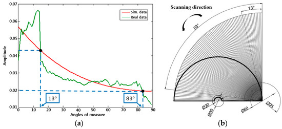 The attenuation curve and the corresponding scanning sketch based on the fan-beam iterative method are shown in Figure 22a,b. The signal attenuation becomes evident within the scanning range of 83° to 90° in the area where a defect starts to appear. Particularly, the illumination area can cause a “dead zone” due to the geometrical features (the diameter of the slit mask used in this work is 60 mm). In other words, the detection cannot be achieved effectively along a full circle arc when the line laser source is used. As shown in Figure 22, the signal within the scanning range of 0° to 13° was invalid data.