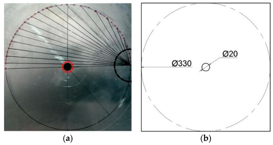 It is unnecessary to test the “dead zone” when the DHB algorithm is used because the short-scan condition can be relaxed to a great extent. The real data shown in Figure 22 also supports the advantage of this new DHB algorithm compared with FBP or other algorithms. Figure 23a,b is a sample drawing and specimen of the initial single defect. The imaging of the penetrating hole is given in Figure 24. There are 36 emitter and receive points. If there are 19 receiving points from a single emitter point to a semicircle, and inspection is performed up to the 20th emitter point, 361 data points can be collected. Complex shapes or multiple defects should be inspected up to the 36th emitter point, but a single circular defect, as shown in Figure 24, was able to quantitatively represent the defect. The imaging of the defect is displayed clearly compared with the defect-free area.