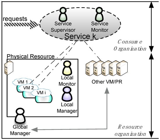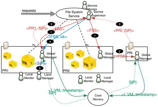 The services are deployed on servers, which represent the system’s computer resources. Three roles (local monitor, local supervisor and global manager) associated with the sub-organization that provides resources are also deployed here. The local monitor agent (LMA) is in charge of collecting data regarding the state of the local resources of each physical server—including its virtual machines—(PRi) and transforming these data into adequate information for decision making. The local supervisor agent (LSA) is in charge of the control and distribution of the physical machine’s computer resources, and is able to redistribute resources among the instances of execution, launch or shut down of virtual machines. Its objective is, therefore, the efficient management of the individual resources of the physical server between the different nodes it hosts, maximizing its use, but without diminishing the quality of the services being provided; and, ensuring that the physical machine always has the minimum resources to perform the tasks of coordination and control. Its work is carried out in close collaboration with the server’s local monitor agent. The SLA and the local monitor have total knowledge of each individual server, but at the same time uncertainty regarding the rest of the infrastructure. The global manager (GMA) is the role in charge of making decisions about how to distribute the computer resources among several nodes of the CC platform, and not only at a local level as in the case of the LSA’s role. In order to provide assistance to the decision-making process regarding the means of distributing resources, they use a partial knowledge base (provided by the LMA role) and past experiences stored in the usage history repository, which is achieved by relying on the CBR model [23]. The GMA’s role is to determine how and with what characteristics the new service-associated virtual machines will be instantiated. Additionally, it is also responsible for the process of compacting the existing virtual machines into a smaller number of servers, so that it is possible to shut down physical servers and reduce energy consumption. Given that it is possible to stop and start execution nodes, it is also possible that these agents enter and leave the system dynamically, linking their life cycle to that of the server they monitor or control.