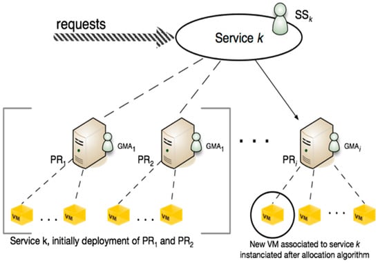 The reallocation process is initiated by the SSA associated with the service that is experiencing difficulties in responding to demand, as shown in Figure 4. This figure shows a hypothetical case of communication among the agents presented in Figure 3, where service k is deployed on virtual nodes hosted by three servers (PR1,2 and i) that have been represented as vertical lines. The servers host their agents and processes as described. The communication between agents and other processes is indicated by arrows. The aim of the communication is to find a solution—S(P)—to service demand.