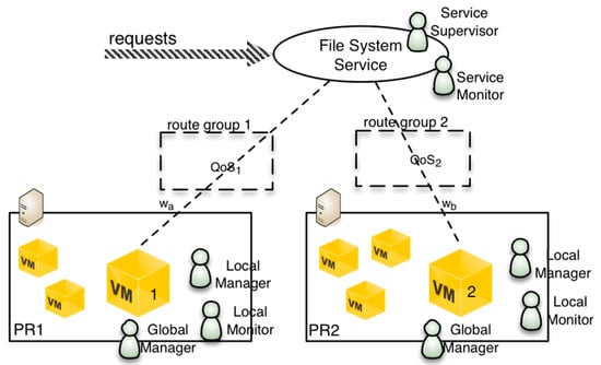 With regard to the distribution of the initial resources (see Figure 5), a Cloud service—the file storage service—is deployed in different virtual nodes (VM1 and VM2), each one hosted by a different physical machine (PR1 and PR2, respectively). The result obtained with this deployment is that the service is highly available (deployed in two servers), and it is also deployed in two physical machines with different computational loads, something that happens in real environments, since the two physical machines host other virtual machines that correspond to other services of the CC platform. In other words, the physical server PR1 has many available and unallocated resources, while PR2 has no available resources and the machines it hosts have a high computational load.
