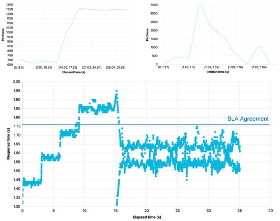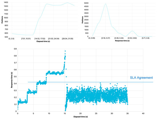Experiment 2: Readjustment of the infrastructure resources for the method “GetSize” ((top left) increase in request; (top right) time response of request; (bottom) whole adaptation process).