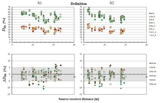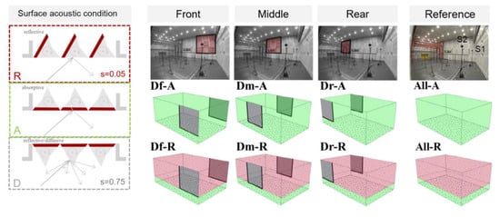- The objective parameters are not significantly influenced by the diffusive surface location. No clear trend can be observed for T30, C80, D50, and Ts variations in the different configurations in both the absorptive (-A) and reflective (-R) conditions. EDT results as the most affected parameter.