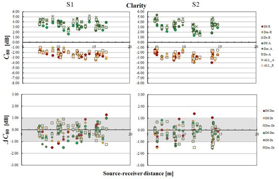 - Martellota, F. The just noticeable difference of center time and clarity index in large reverberant spaces. J. Acoust. Soc. Am. 2010, 128, 654–663. [Google Scholar] [CrossRef]