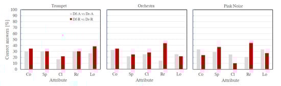 - “What kind of difference could you perceive?” The answer was given by selecting the relevant attributes (coloration, spaciousness, clarity, reverberance, and loudness) that have been perceived as different. Listeners could choose more than one option or indicate other unincluded attributes.