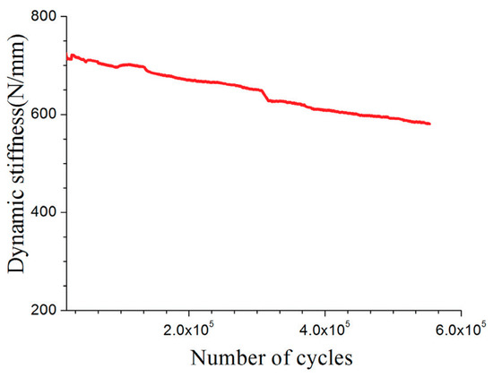 It has been experimentally proven that tire stiffness decreases with an increasing number of cycles during dynamic testing, as shown in Figure 1 [22]. From the experimental results of a series of static and cyclic loading tests, it is clear that the effects of thermal aging on the fatigue parameters of rubber compounds are significant and should be taken into account in designing rubber components [25,26,27,28].