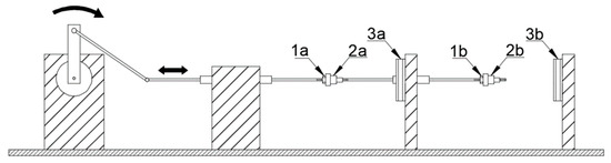 The schematic structure of the experimental setup for testing cuffs at a temperature range from 4 °C to 20 °C (Elements for setting oscillation amplitude: 1a/1b—contra thread 2a/2b—body for fastening of a smaller diameter of a cuff, 3a/3b—body for fastening of a bigger diameter of a cuff).