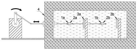 The schematic structure of the experimental setup in the temperature range from −4 °C to −20 °C (Elements for setting an oscillation amplitude: 1a/1b—opposite thread 2a/2b—body for fastening of a smaller diameter of the cuff, 3a/3b—body for fastening of a bigger diameter of the cuff, 4—thermo insulated chamber with a refrigerating device).