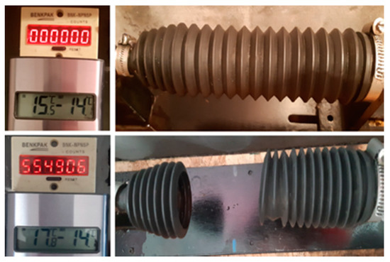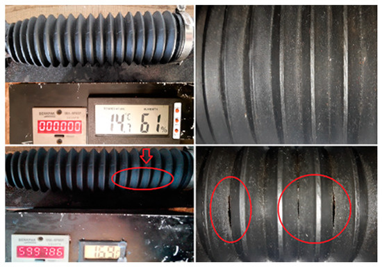 Figure 6 presents the start and end of the testing process of the cuff taken from a vehicle made by Volkswagen, which was exploited in the northern region for a long time. The ambient temperature during the testing process ranged from 14.8 °C to 19.4 °C, and the cuff that had been exploited in the northern region was damaged after 2,599,876 oscillations of the simulator (the testing lasted about 16 days and 21 h).