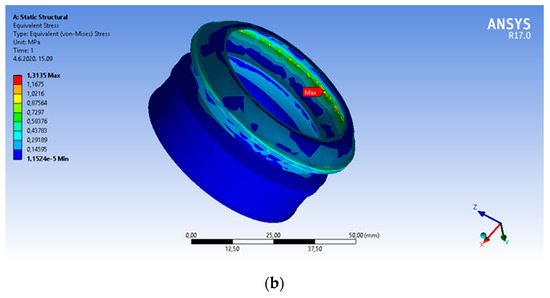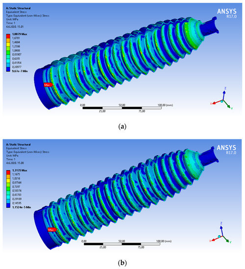 Equivalent von Mises stresses in longitudinal cross-section of a cuff (isometric view) at different temperatures: (a) at −20 °C; (b) at 20 °C.