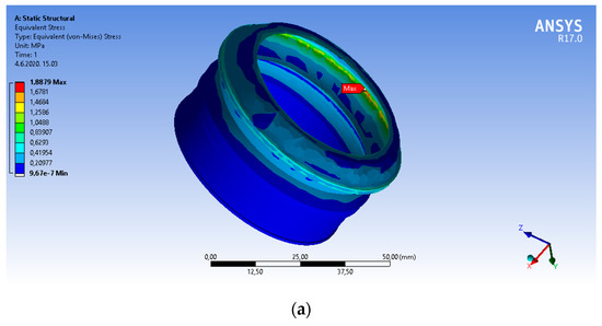 The numerical analysis shows that the maximum equivalent stresses at a temperature of −20 °C (1.8879 MPa) are about 30% higher than those at a temperature of 20 °C (1.3135 MPa). This is due to the known effect of the reduced the elasticity of materials (increasing stiffness) at lower temperatures.