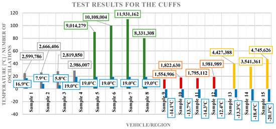 The test results of the cuffs at temperatures from −4 °C to −20 °C, corresponding to the exploitation conditions in the southern region, are presented below. Four samples of the cuffs from the northern region, and three from vehicles used in the southern region were tested. The results of the number of oscillations to which the samples were exposed, as well as other relevant data, are given in Table 6.