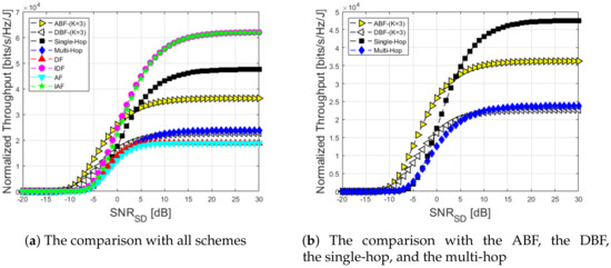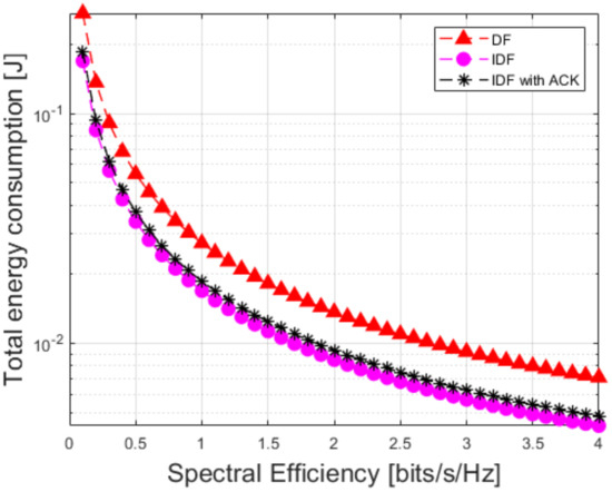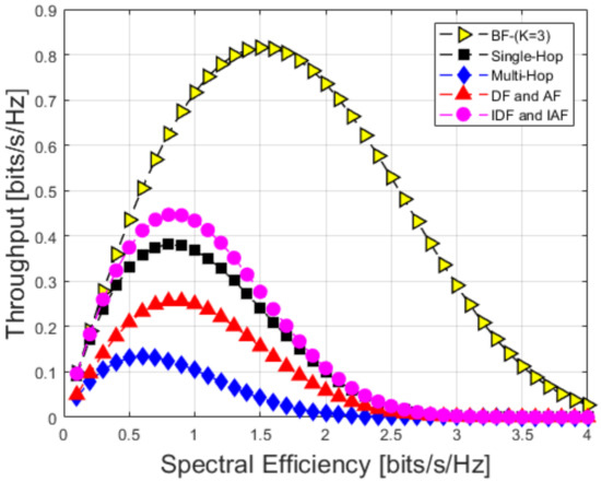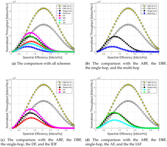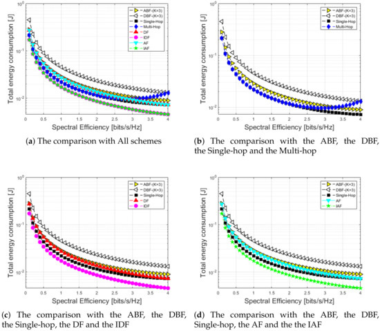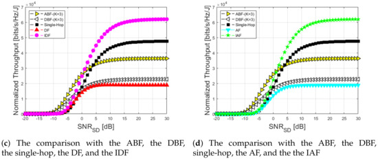- The simulation results clearly show that first, the incremental cooperative scheme had the lowest total energy consumption in overall spectral efficiency. In terms of the throughput performance, the beamforming scheme had the best performance in the overall SNR (signal-to-noise ratio) range from −20 to 30. Whereas, in terms of normalized throughput performance the ABF had the best performance in low SNR range from −20 to 1 dB, but in a high SNR range from 2 to 30 dB the IDF had the best performance.