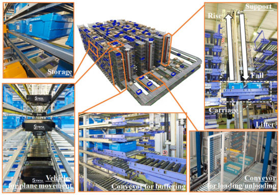 Figure 1 shows the components of the automatic storage system targeted for anomaly detection in this study. The general function of the system is to store products scheduled for shipping; storage is automatically managed in the rack section using the shuttle vehicles shown in the figure. To put the products into and to take them out of storage, a conveyor for horizontal movement and a lifter for vertical movement are used. In many cases, the racks and conveyors in the system can be replaced immediately if one or more of their parts fail. Repairing/replacing the lifter, however, is not so easy. The lifter is essential for vertically conveying products and for distributing them to the various storage layers. It is expected that it will deteriorate more quickly than the other system components because of following reasons: Firstly, the lifter operates continuously for 24 h every day. Secondly, it frequently repeats drastic acceleration/deceleration. Thirdly, loading and unloading products on the carriage of the lifter are continuously repeated. If a problem occurs in the lifter, because of following reasons, it can have a relatively large impact on the movement of products to the shelves in each storage layer. Firstly, because the mechanical elements in the lifter are closely related and joined with one another, it often takes time to replace them in the event of a failure. Secondly, the repair of the lifter requires much time compared to that of the horizontal belt conveyor because the lifter is located in quite a narrow space surrounded by tall partition walls and, therefore, it needs to be repaired by a few people. As a consequence, effective anomaly detection for this part of the system is particularly important; if potential failures in the lifter can be predicted in advance, it is possible to minimize the economic loss due to equipment stoppage. In this study, we developed a prediction technique that can detect lifter failure in advance. As shown in Figure 1, as the lifter moves up and down, the carriage on which the product is placed moves up and down with it; in the operation of the lifter, vibration propagates to the entire body, including the steel columns supporting the lifter and other individual parts. With the proposed method, the transmitted vibration is detected by an accelerometer placed at optimal points on the body and changes in the vibration characteristics are effectively captured. Details of the method are described in the next section.