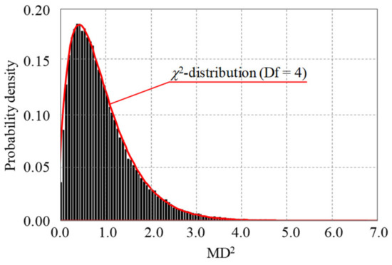 If each feature value for the normalized data used to generate the unit space follows a normal distribution, then follows a distribution with k degrees of freedom [16,17]. In this study, the number of bands is k = 4, as will be described later. To confirm the statistical properties such as the normality of the data, Figure 3 shows the probability density distribution of the calculation results of in the normal case. Here, it can be seen that follows the distribution with four degrees of freedom. The distribution with four degrees of freedom has a critical value of 13.3 when the probability level is set at 0.01. Therefore, in this study, the evaluated vibration is regarded as anomalous when exceeds . In order to make it easier to refer to this level, the threshold value for an anomaly was set to obtained by simply squaring MD.