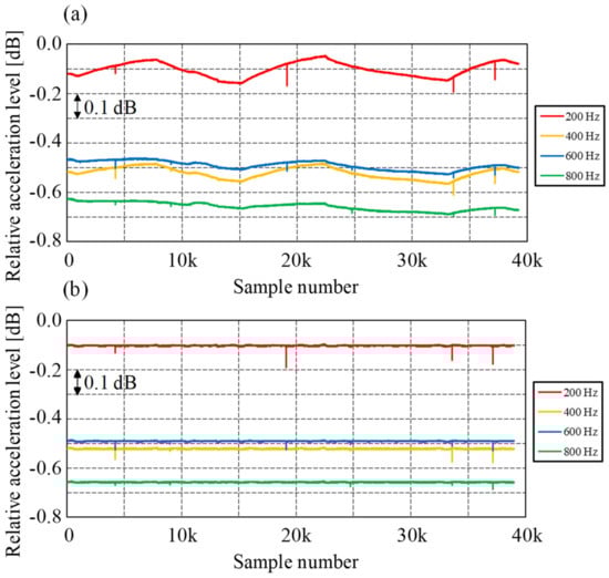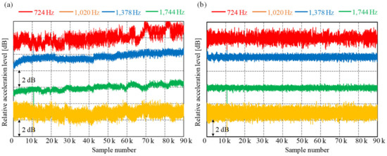 Time-series data of the vibration in the normal conditions (a) without high-pass filtering and (b) with high-pass filtering: Since some trends in the time series of these energy levels in the respective bands were apparent, the periodic components of these series were investigated using the results of FFT processing, and will be removed by filtering.