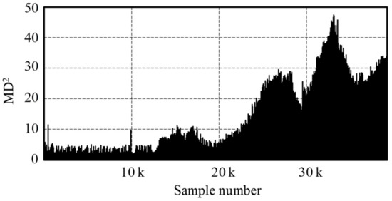 To calculate MD2 under the normal condition, the unloaded lifter was continuously operated in the normal state for nine days. A unit space was generated based on the fragment data (10,046 waveforms) obtained from measurements on the first day; the MD2 of the fragment data for the remaining eight days (80,368 waveforms) in the generated unit space was then produced using the method described in Section 2.