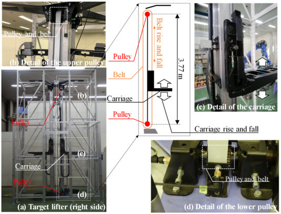 Detailed configuration of the target lifter. In this figure, (a) target lifter of the right side, details of the (b) upper pulley, (c) carriage, and (d) lower pulley are indicated.