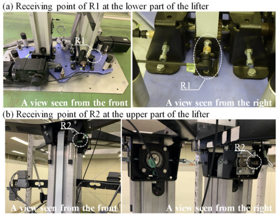 Details of the setting of the vibration receivers on the surface of the lifter. In these pictures, the upper one indicates (a) receiving point of R1, while the lower one indicates (b) that of R2.