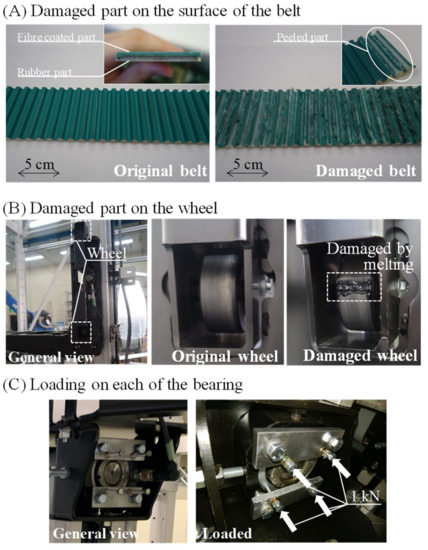 Artificially damaged conditions: (A) damage to belt, (B) damage to guide wheel, and (C) damage to bearings.