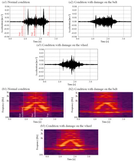 Acceleration waveforms and their spectrograms for the lifter (a1,b1) operating in normal state, (a2,b2) operating with a damaged belt, and (a3,b3) operating with a damaged guide wheel. As shown in Figure 13(a1) and (b1), the waveform starts to sweep up after around 0.9 s when the lifter starts to accelerate; after that, the waveform starts to sweep down after 1.8 s; then finally, the large fluctuation of the waveform finishes at around 2.8 s when the lifter stops.