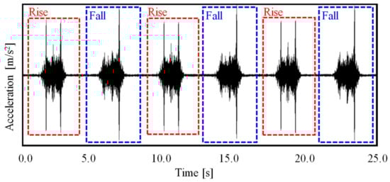 Example of the acceleration waveform for the lifter when rising and descending: These vibration waveforms during the rising and descending phases of operation are slightly different. In this study, only the vibration waveform for the rising phase was used.
