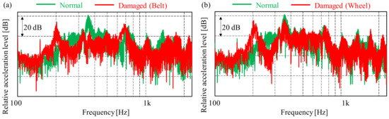 Comparison of the frequency characteristics of the vibration in the normal condition and each of two damage conditions: damaged belt and damaged guide wheel. (a) The frequency characteristics of the peaks and dips when operating in the normal condition differ from those associated with operating with a damaged belt. (b) Shown are some differences between operating in the normal condition and operating with a damaged guide wheel.