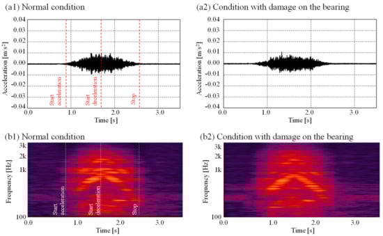 Acceleration waveforms and their spectrograms for the lifter (a1,b1) in the normal state and (a2,b2) operating with a damaged bearing: As shown in Figure 16(a1) and (b1), the waveform starts to sweep up after around 0.9 s when the lifter starts to accelerate; after that, the waveform starts to sweep down after 1.8 s; then finally, the large fluctuation of the waveform finishes at around 2.8 s when the lifter stops. The differences between the normal and damaged conditions observed in the time waveform and spectrogram are relatively small compared to those shown in Figure 13.