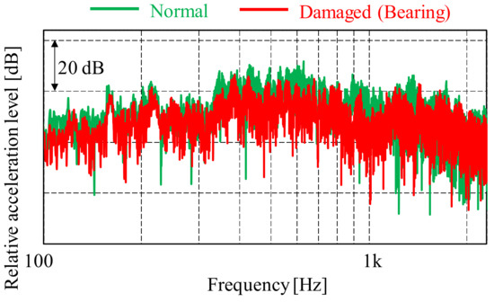 Figure 16 shows the time waveforms and spectrograms obtained by R2 under the normal condition and under the condition of damaged (impeded) bearings. The differences between the normal and damaged conditions observed in the time waveform and spectrogram are relatively small compared to those shown in Figure 13. Figure 17 shows the frequency characteristics in these conditions. In these results, the characteristic difference in the peak-dip tendencies shown in Figure 15 is not observed; however, in the damaged-bearing condition, the energy level is approximately 5 dB lower than under the normal condition over the entire frequency range.