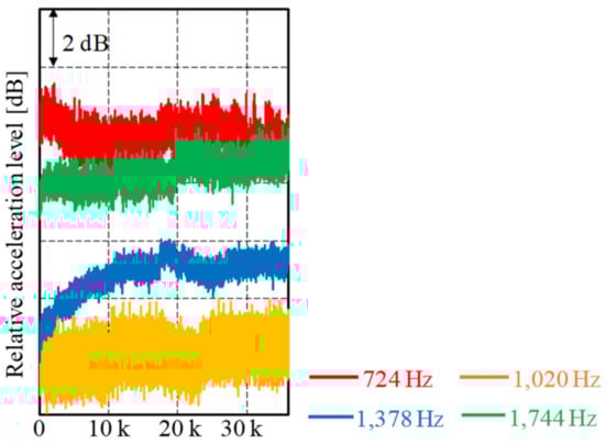 Selection method using frequency bands to calculate the MD2 of the lifter: From these frequency characteristics of the vibration data obtained from R1 during normal operation, the energy levels in the 1/12 octave band around the four prominent peak frequencies at 724 Hz, 1020 Hz, 1378 Hz, and 1744 Hz were obtained and used for the calculation of MD2.