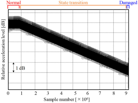 Vibration time-series data under the damaged-bearing condition: In this simulation study, the transition of the energy levels from the normal condition (Figure 19a) to this anomaly condition is simulated to linearly change from one state to the other when operating the lifter continuously for 780 days.