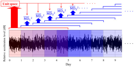 The transition of the time-series energy levels during the simulated 780 days was generated as follows. First, the data for the normal condition for the eight days that were described in Section 4.3.1 were combined repeatedly. The steady-state time-series data for 780 days was then linearly decreased to smoothly connect to the energy levels under the condition of a damaged guide wheel. As an example, the data for the 1378 Hz band are shown in Figure 24. In these data, the energy level decreases monotonically by approximately 5 dB over the 780-day period. Then, as shown in Figure 25, by using the time-series data of the first five days (50,460 data values), the unit space was generated. Next, the 50,460 values of MD2 for the five days beginning on the second day were calculated and the average value, 2, was treated as the first MD2 data value. This operation was performed in the same manner for all of the data simulated over 870 days, each time advancing the five-day range by one day. The resulting 2 () values are given in Figure 26a. As shown in the figure, the value of changes as the energy level changes from the normal state to the anomaly state. The for the first 200 days is shown in Figure 26b. The threshold value of 3.3 is also shown.