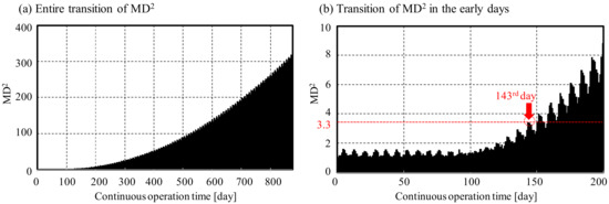 The values of do not appear to change from approximately 1.0 through the first 90 days of operation, as the state during this period had not changed. However, the value of starts to rise from the 91st day due to the changing state of the device to the anomaly condition; 53 days later (i.e., 143 days from the beginning of the data), exceeds the 3.3 threshold. Thus, based on the results of our simulation, where we assumed that, over the course of 780 days, the normal state would change to an anomaly state in which the value of MD2 is approximately 300 (Figure 22c), we were able to detect at quite an early point—in fact, within the first 7% of the total elapsed time—that an anomaly had occurred.