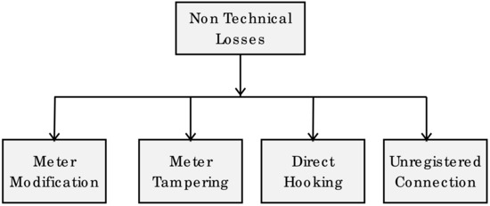 NTL occurs as a result of meter modifications, meter tampering, direct hooking and unregistered connections [7]. The categorization of the NTL is shown in Figure 1. Meter tampering causes the meter either to stop functioning or to stop registering the amount of electricity consumed. In contrast, meter modification is done in the internal settings of a meter to alter its readings. In the direct hooking approach, the consumer taps into a power line from a point ahead of the energy meter, whereas in an unregistered connection, the utility has no record of consumers.