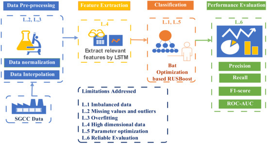 Further research is needed to adequately solve the problems of ETD and overcome the challenges of the poor detection of theft due to imbalanced data and the limited capability of ML algorithms. From the existing literature, we have found that only a few papers have considered the effects of imbalanced data in their system models. The authors in the literature addressed the class imbalance problem by utilizing SMOTE; however, this causes overfitting and replicates the nearest neighbor’s samples, which do not reflect real world theft cases. In this paper, we used the RUSBoost method to deal with the imbalanced data. In addition, the traditional machine learning algorithms are used for the classification of ETD; i.e., SVM and LR. However, these methods fail to capture the consumption pattern of large time series data and result in overfitting. Moreover, deep learning techniques have become dominant for capturing real theft cases and have performed better with high-dimensional data. This encouraged us to exploit an LSTM technique to to achieve generalized performance. Additionally, it is necessary to optimize the parameters of classifiers for optimal classification. The authors in the literature have not paid sufficient attention to parameter tuning in their classification; in this regard, we exploit the bat optimization algorithm, which improves the classification of our model.