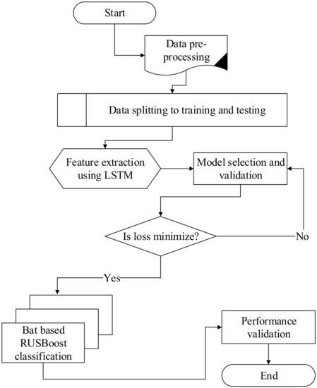 The proposed system model for ETD is shown in Figure 2. Our proposed model is mainly composed of three parts: (1) data pre-processing, using interpolation to compute the missing values in the dataset—the data are then normalized and passed to the next model for feature extraction; (2) the LSTM is utilized to extract the relevant features; and (3) the refined features are given to the bat-based RUSBoost algorithm for classification. For comparative analysis, various performance metrics are used—i.e., F1-score, precision, recall and the ROC curve—to validate the effectiveness of our proposed model.