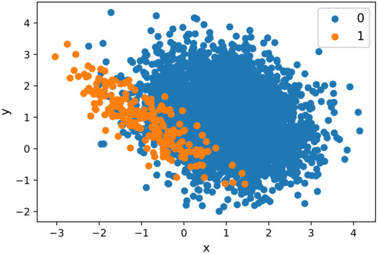 In this section, we describe the problems of the conventional models described in Section 2; i.e., the class imbalance problem, overfitting issue, the handling of missing values in the dataset and lack of parameter optimization during classification. Firstly, we present the performance of our proposed model on raw data. Initially, the missing values in the dataset are filled with the interpolation method. Additionally, the data are normalized using the min–max scaling method. The visualization of the data in Figure 5 shows the imbalanced distribution of labels; i.e., the number of thieving users is represented by “1”, while “0” shows honest customers.