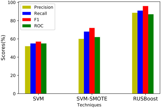 The consequences of using imbalanced data are that it trains the classifier on a majority dataset, which results in the classifier being biased towards identifying fraudulent electricity consumers. In this regard, the RUSBoost method is effective, as already described in Section 3.4. It achieves the benefits of RUS and adaptive boosting techniques. It is efficient in dealing with data imbalance problems. In order to show the effects of imbalanced data, we also implement SMOTE along with the SVM technique. The authors in [22,23] used SMOTE to solve the data imbalance problem. In the SMOTE technique, the samples of the minority class are increased by taking the information from their nearest neighbor. This gives rise to the overfitting problem, and more execution time is required to run the process.
