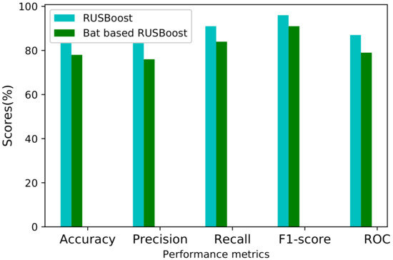 During model validation, the hyper-parameters of RUSBoost are tuned to find optimal values. The hyper-parameters are the learning rate, estimator and sampling strategy. We optimize the learning rate of RUSBoost. Setting the hyper-parameters manually is a time-consuming task. The bat algorithm is efficient for finding the optimal value of the learning rate. The results in Figure 7 show that parameter tuning enhanced the performance of our proposed model in terms of all performance metrics.