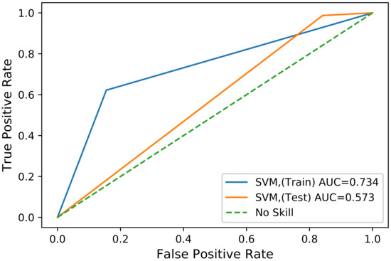The SVM is a popular method used for the classification of ETD. However, it fails to achieve generalized performance. The SVM gives better results for training data. However, for out-of-sample data, the model tends to overfit. The overfitting in SVM for high-dimensional data is evident from Figure 9; i.e., the AUC for the training data is 73.4%, and the AUC for out-of-sample data is only 57.3%. Thus, due to the generalization problem, its performance degrades. The confusion matrix for this model also shows a high FPR, which means that it falsely rejects the theft cases during classification. Table 11 shows the TP, TN, FP, and FN values for SVM. Furthermore, SVM covers less area under the ROC curve than our proposed method. This model has poor performance compared to the other benchmark schemes. Thus, SVM is not suitable for the class imbalance problem considering high-dimensional data.