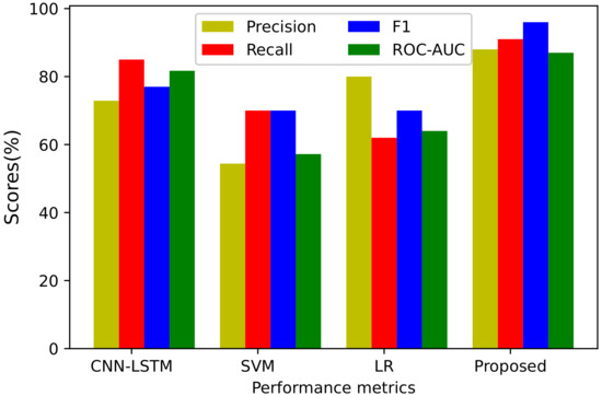 The summary of results is given in Figure 12 and Table 13. In order to validate the performance of the proposed system model, it is compared with the state-of-art benchmark schemes. We use reliable performance metrics such as the precision, recall, F1-score and ROC curve. For comparison, the benchmark models used in this paper are LR, SVM and CNN–LSTM models. The results prove that SVM performs worst compared to the other benchmark schemes. This is due to the fact that SVM does not handle large time series data; for massive data, it causes overfitting. We see from Figure 9 that, for testing data, the result of SVM is shown to be the worst: i.e., it achieves an ROC curve of 57.2%. The CNN–LSTM model shows better performance compared to SVM and LR; i.e., the value of the ROC curve is 81% and recall is 85%. It is considered to be the best model among the benchmark schemes. The CNN–LSTM model performs better because it is a deep learning model and can handle large time series data well.