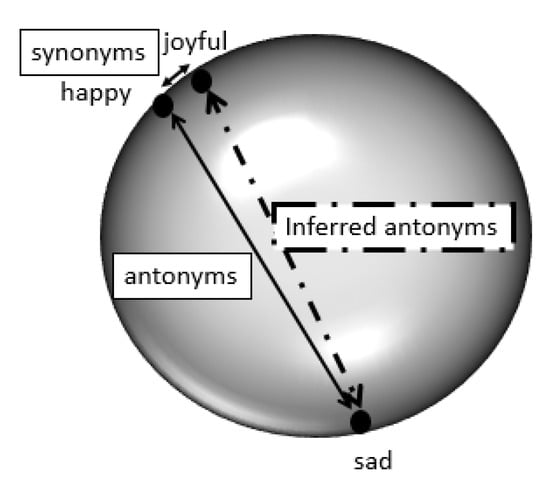 Figure 1 illustrates the concept of the proposed approach. As shown in the figure, the two vectors corresponding to the words “happy” and “joyful” have close similarity because they are synonyms. On the other hand, the vectors corresponding to “happy” and “sad” are on opposite poles and have a similarity score of −1, because they are antonyms. The algorithm can infer a new relation that “joyful” and “sad” are antonyms too, as their corresponding vectors are also placed close to opposite poles of the sphere.