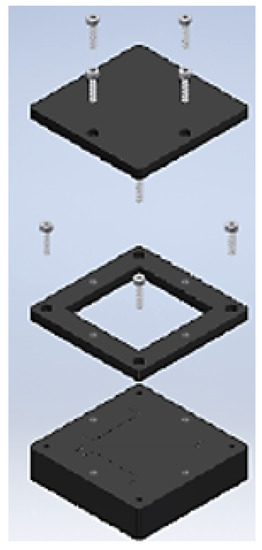 The MRE transducer mold was designed as a 3-layer device. The floor layer contained cavities with a specific pattern based on a strain-gauge rosette. The middle layer was screwed to the floor, and it allowed the samples to be extracted. The top layer was screwed to the middle layer to close the mold. The complete CAD mold is shown in Figure 2.