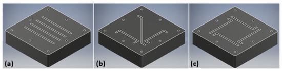 As part of the research activities, three different designs for the MRE transducer were implemented—a horizontal array with 4 lines, 4 lines in a rosette array with 90° among lines, and another rosette arrangement with 3 lines and 45° among them. These designs were modeled in Autodesk Inventor 2018, and printed in 3D with polylactic acid (PLA) material. The array of 4 lines had 4 cavities in the floor layer, describing a pattern of four parallel lines to measure electrical-resistance variations just in one axis. The rosette arrangement with 3 lines of 45° had a different pattern in the floor layer; it had 3 cavities, one at 0°, another line at 45°, and the third at 90° to measure electrical-resistance variations in two axes and their components at 45°. The third pattern proposal had two pairs of lines on its floor layer that were placed oppositely and a 90° rosette strain gauge. The CAD drawings of all the developed patterns are shown in Figure 3.