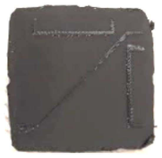 To overcome the aforementioned problem, rubber and catalyst percentages were changed. The first layer consisted of 97% silicone rubber (ratio 10:1 of silicone rubber to catalyst), and 3% MWCNT-Fe particles (some trials with a different percentage of particles were carried out before selecting this rubber–nanoparticle percentage ratio). This ratio of silicone rubber to MWCNT-Fe particles was chosen because the second test had satisfactory results—the observed electrical-resistance characteristics were suitable for sensing (i.e., the elastomer exhibited the required elastic behavior). The manufactured 2-layer MR elastomer with nanoparticles is shown in Figure 5.