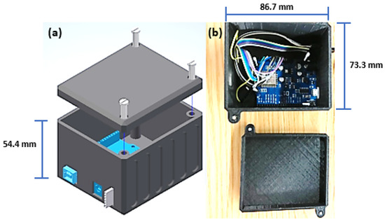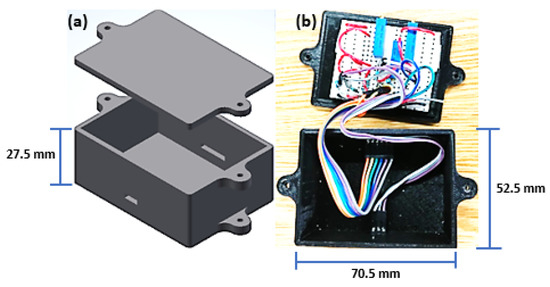 The protective case consisted of two parts—base and cover—which were attached and secured by holes filled with M3 screws. Moreover, fixed headers were added to the case to connect the conditioning circuit to the CPU module and the strain-gauge terminals. The connection with the CPU module was a 6-pin cable, providing −5 V, electrical ground, and +5 V inputs. The last 3 pins were analog outputs, of which only 1 was used, while the others remained just for symmetry with the CPU case. The case was modelled in 3D with Autodesk Inventor. To manufacture the case, it was printed with polylactic acid (PLA) filament, and all components were stored inside it. The performed phenolic plate was attached with double-sided foam to the bottom of the case, and the data cables were fixed with glue at the sides of the case. The CAD model and the manufactured prototype are shown in Figure 7.