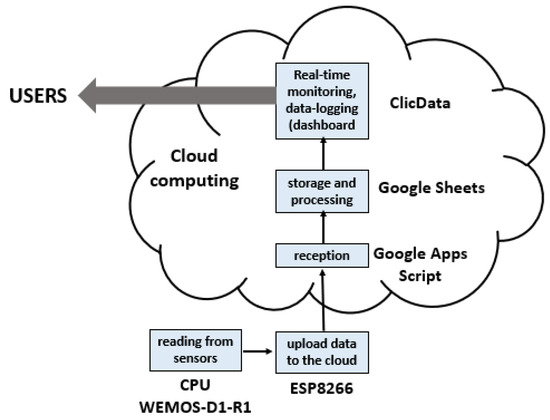 To present the results on the dashboard, configuration was carried out within the webpage. The users had to schedule the updating periods or updating cycles for each desired information panel. The shortest time lapse between updates that Clic Data managed was 1 min. The Google spreadsheet needed to be updated along with the dashboard, so the same schedule was set. After displaying the link in the browser, it needed to be refreshed by the user to visualize changes on the dashboard, or changes were communicated via email. The server was configured to send an email to the user with the dashboard attached after every update. The summarized data processing from the CPU to the cloud computing and the dashboard followed the sequence in Figure 9.