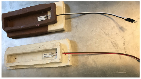To create an adequate and efficient way to generate voltage from the piezoelectric element, a rubber cantilever beam was manufactured to increase the vibrations in the piezoelectric sensor. The first step was to create an adequate mold for the rubber structure. The clay mold used for this experiment is shown in Figure 10. After the clay cast for the rubber plate was created, the piezoelectric sensor was positioned to enhance voltage production. The selected position was the edge of the mold, where output cables came out of the mold to connect it to the circuit.