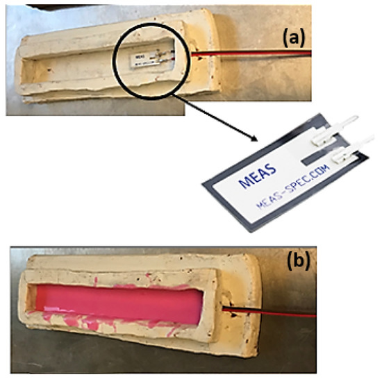 (a) mold filled with rubber-based mixture; (b) MEAS piezovibration sensor inside an empty mold.